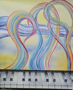 1992Een levendig spel van opborrelende vormen en tinten vult het doek in een bijna ritmische beweging.